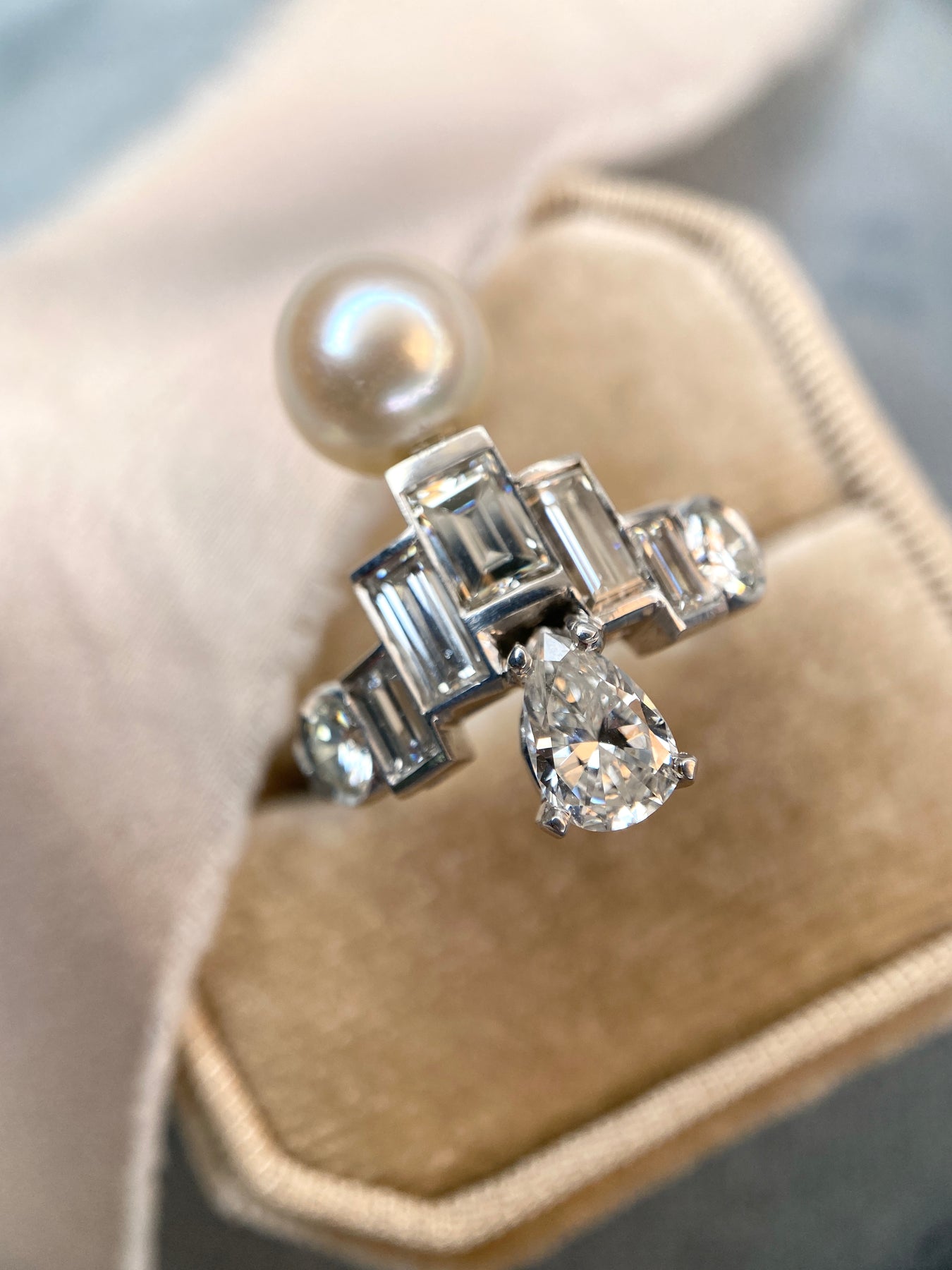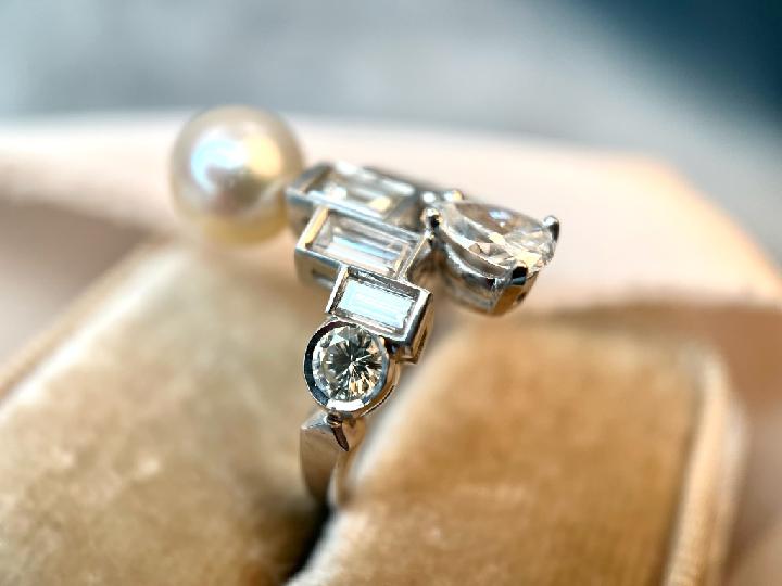 This Art Deco vintage ring features a Cream Pearl and Diamonds in a unique setting. We love the glamour and luster of this creative piece!